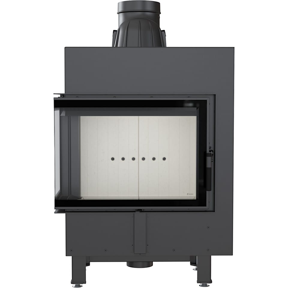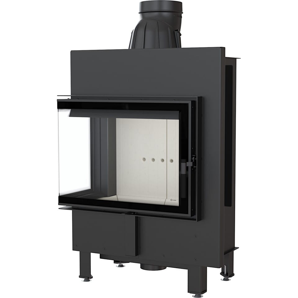 Kratki LUCY 12 lewy BS. Wkład kominkowy wykonany z najwyższej jakości stali wysokogatunkowej wycinanej laserowo i wyginanej za pomocą giętarki CNC, spawy wykonane w osłonie gazów szlachetnych, dzięi którym zachowuje doskonałą szczelność. Płytka komora spalania wyłożona materiałem akumulacyjnym ciepło Acumotte dzięki, któremu wkład dłużej utrzymuje temperaturę. Zamontowana zdobiona narożna żaroodporna wytrzymująca tempereturę 800°C szyba typu glass z systemem czystej szyby (poprzez nawiew powietrza na szybę) pozwoli na delektowanie się płomieniami ognia w kominku. W bocznie otwieranych dzwiczkach zamontowano elegancką ergonomiczną rączkę. Dzięki mocy nominalnej 12 kW szybko i sprawnie ogrzeje wnętrze, a zaawansowane technologie użyte przy jego konstrukcji pozwolą na długie oddawanie ciepła do wnętrza. We wkładzie zastosowano: potrójny system dopowietrzania komory spalania, wbudwany króciec dolotu powietrza, dzieki któremu doprowadzone jest powietrze jedynie z zewnątrz, deflektor odpowiadające za katalizację i dopalanie spalin, optymalizują proces palenia, zatrzymuje ciepło w komorze spalania oraz pomagają w utrzymaniu czystości szyby, wyjmowany ruszt i popielnik oraz ozdobny płotek, który ma za zadanie również zabezpieczyć przed wypadaniem drewna.
