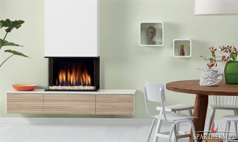 Gazowy wkład kominkowy Spartherm DRU 60 triple BF RCE. Wyróznia go spośród konkurencji zastosowane nowatorskie technologie oraz wysoka jakość wykonania, elegancki design, a także pełna wizja ognia w piecyku do złudzenia przypominająca ogień w klasycznym kominku. Kominek pracuje w systemie zamkniętym i powinien być podłączony do kominka za pomocą rury koncentrycznej. Palenisko wyłożone panelami ceramicznymi imitującymi drewno. Wykończenie wnętrza w kolorze Schwarz glatt (czarny mat).