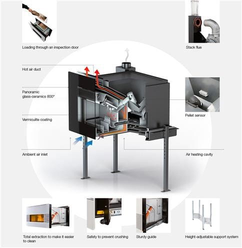 Wkład na pelet Eolo Air czarny 8,0 kW idealnie sprawdzi się w każdym energooszczędnym domu. Wkład o niezwykłym wyglądzie wykonany z najwyższej jakości materiałów. Przejrzysta prosta szyba pozwala na delektowanie się płomieniami ognia w kominku, dodatkowo wyposażona w system czystej szyby. Drzwiczki wyposażone w minimalistyczne uchwyty. Ciepło odprowadzane jest w sposób naturalny poprzezkonwekcję oraz radiację co sprawia, że jest to bardziej przyjazny dla otoczenia sposób ogrzewania, powietrze jest mniej suche dając pełen komfort.